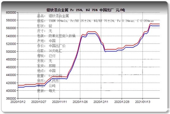 配图为2020年10月-2021年1月镨钕混合金属价格走势图。