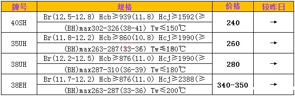 钕铁硼40SH价格240元/公斤,38UH价格260元/公斤,38EH340-350元/公斤。