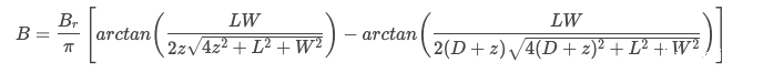 这里Br表示剩磁场,“z”表示对称轴上距磁极表面的距离,“L”表示磁铁块的长度,“W”表示块的宽度,“D”表示块的厚度(或高度)。