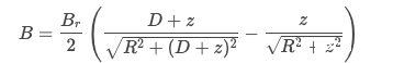 在这种情况下,“Br”还表示剩磁场,“z”表示对称轴上距磁极一侧的距离,“L”表示圆柱体的厚度(或高度),“R”表示圆柱体直径的一半。