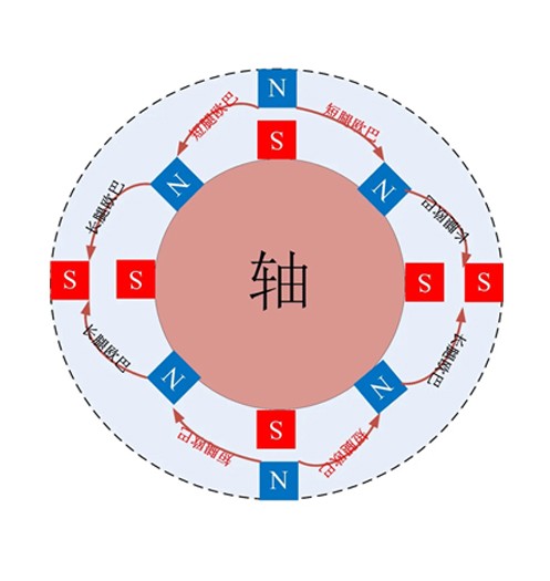 定转子极对数不同时,电磁转矩受力情况可以利用磁势能微分求解,这里不用眼花缭乱的公式,画出定子极对数为2、转子极对数为4时定转子不同位置的受力情况。