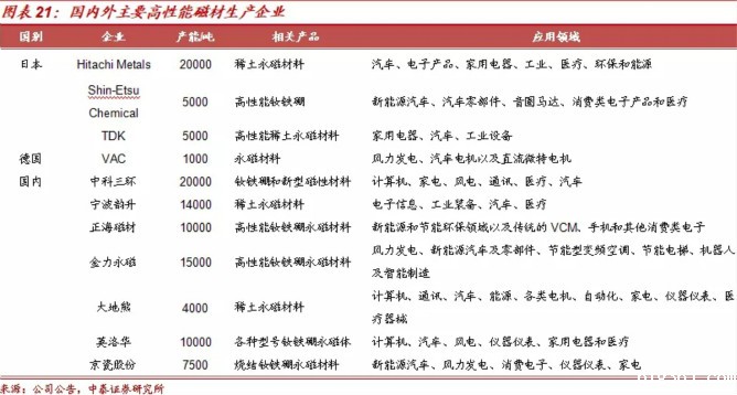 目前国外主要高性能稀土永磁材料生产厂家有:日本(Hitachi Metals / Shin-Etsu / Chemical / TDK),德国(VAC)。