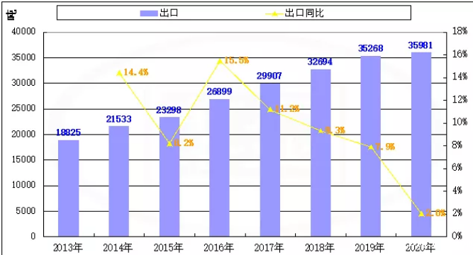 2013至2020年,中国稀土永磁体出口量持续增长,8年间从18825吨增长至35981吨翻倍。不过,同比增幅却表现为下降,从2014年的14.4%降至2020年的2%,自2017年开始则连续下降。