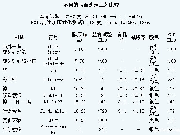 下表为磁铁各种镀层耐盐雾、耐湿热、耐腐蚀度评价