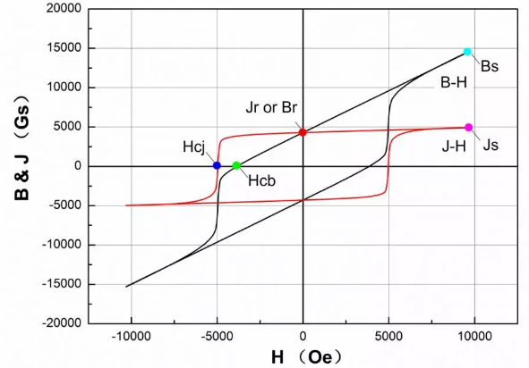通常,采用永磁铁氧体测量系统来获取铁氧体产品的剩磁(Br)、矫顽力(又称磁感矫顽力,Hcb)、内禀矫顽力(Hcj)等磁性能参数。在测试过程中,会得到下图所示的两条曲线,即J-H曲线与B-H曲线。这两条曲线又称为磁滞回线,当中涉及到了三个物理量——J(磁极化强度)、B(磁感应强度,又称为磁通密度)及H(磁场强度)。前面提到的Br、Hcb、Hcj等磁性能参数均衍生自这三个物理量。本期将介绍这三个物理量的来源与含义。